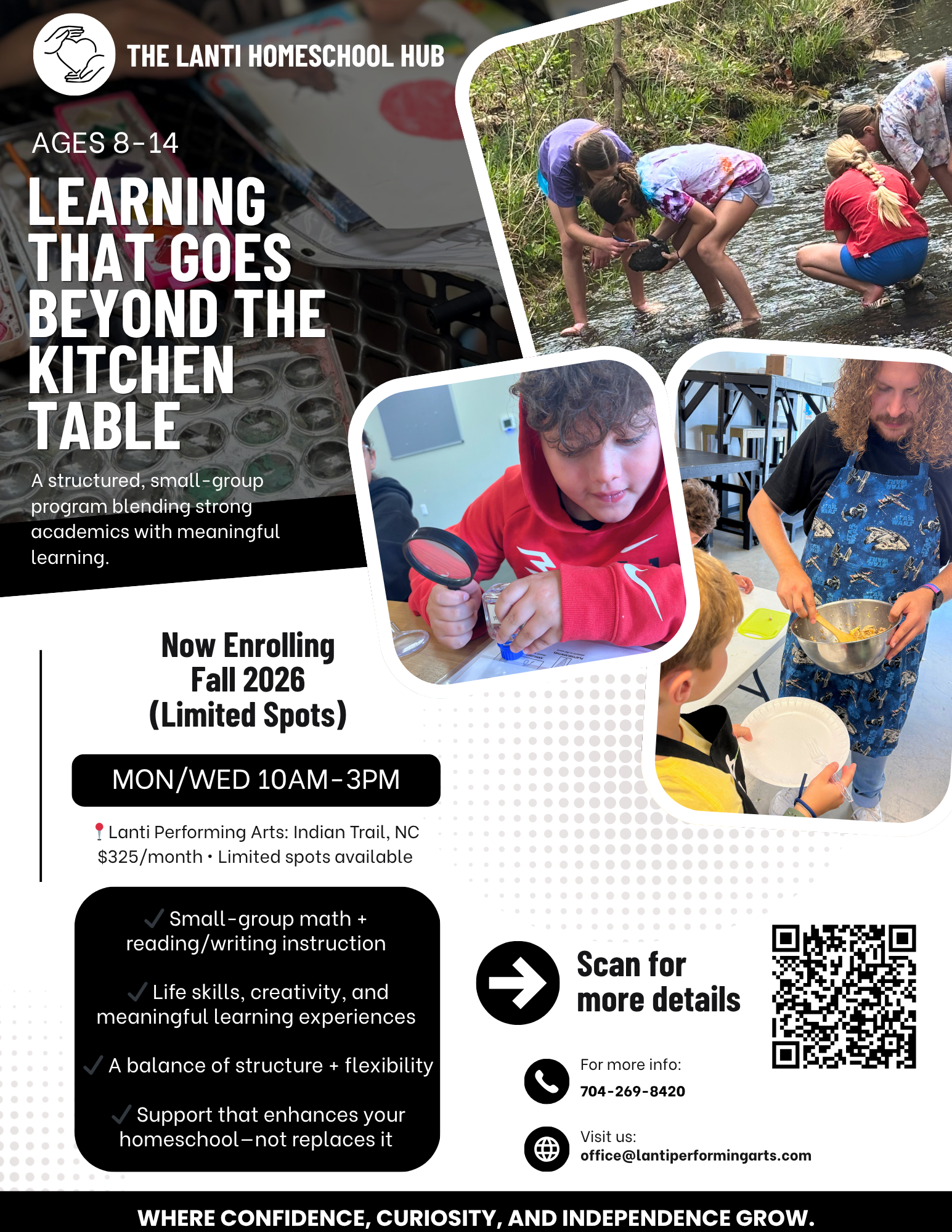 Expanded Homeschool Hub! Homeschool Hub will now include core academics, life skills, passion projects, music, theatre, art, and monthly field trips. Want more details? Scan the QR Code and receive an Info Pak with all the information!